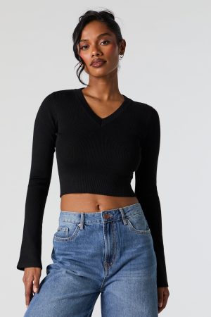 Ribbed Knit V-Neck Bell Sleeve Cropped Sweater