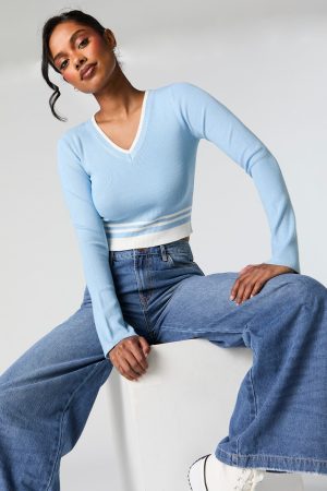 Striped Knit V-Neck Bell Sleeve Cropped Sweater