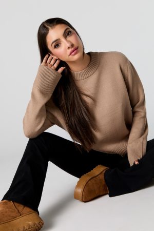 Solid Ribbed Knit Crewneck Skimmer Sweater