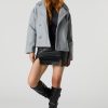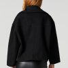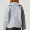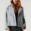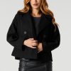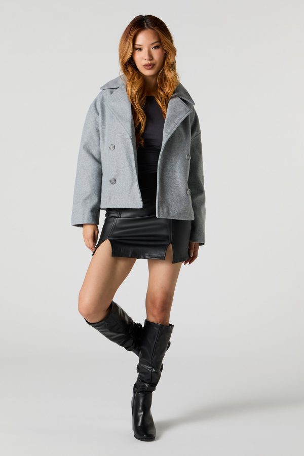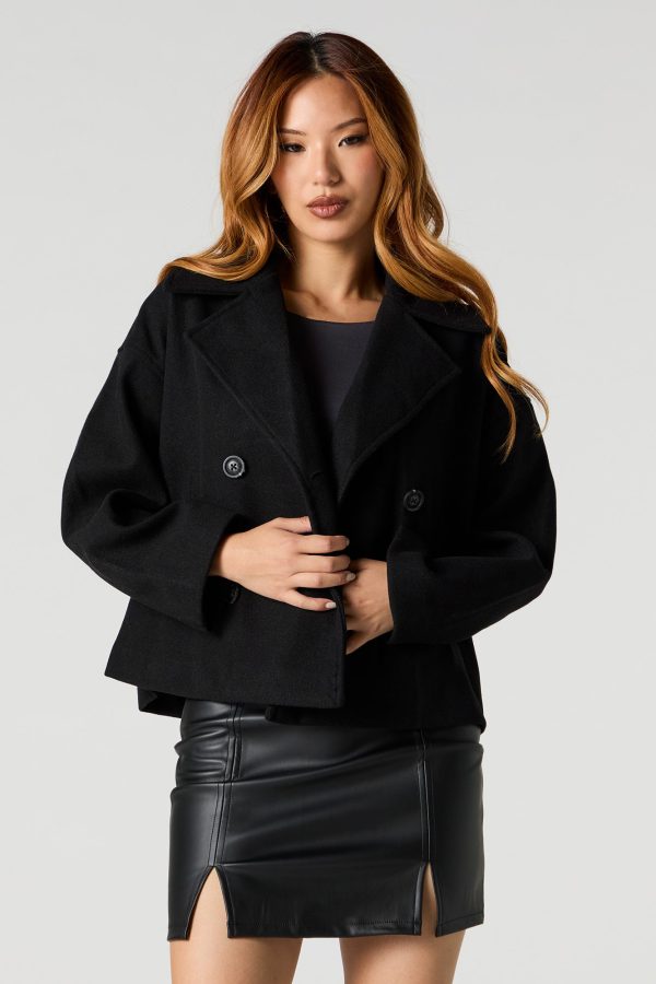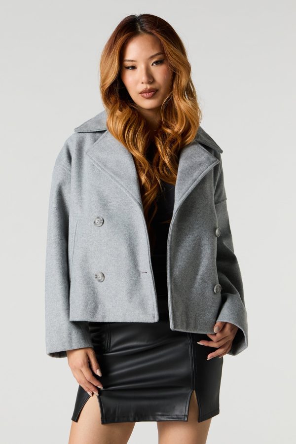 This coat features collared neckline, double breasted construction, pockets, long sleeves, and short length.