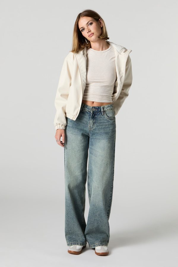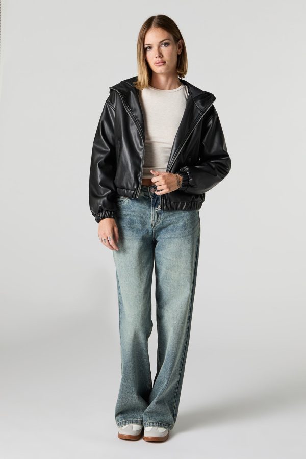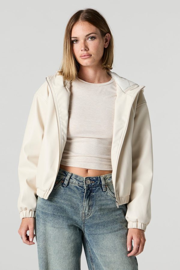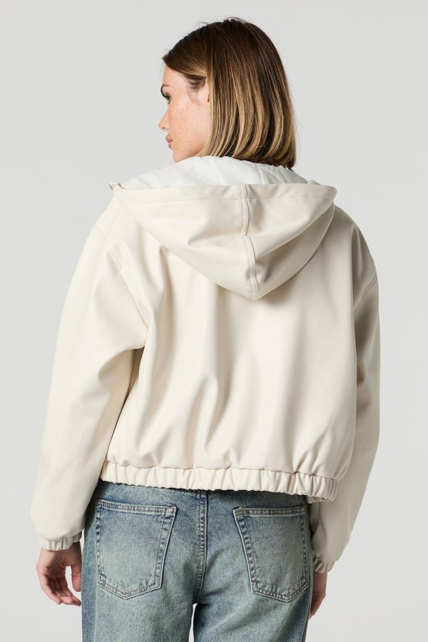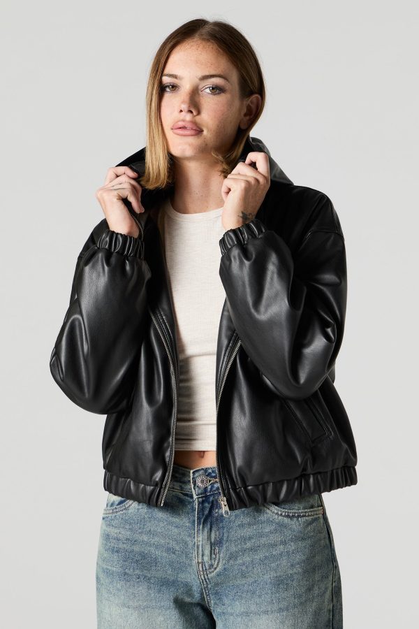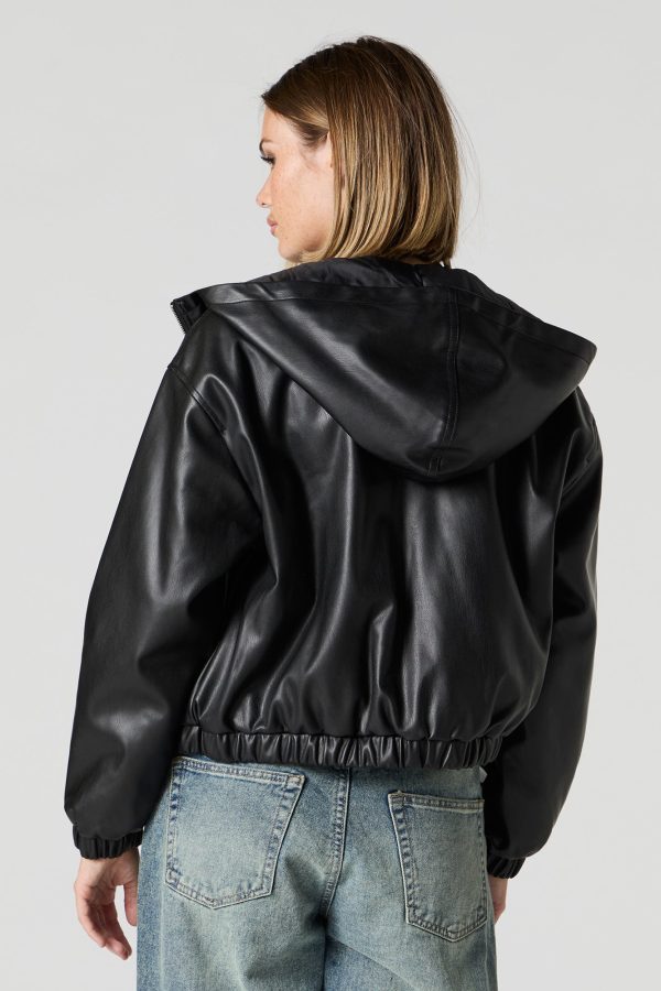 Faux Leather Hooded Bomber Jacket
