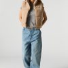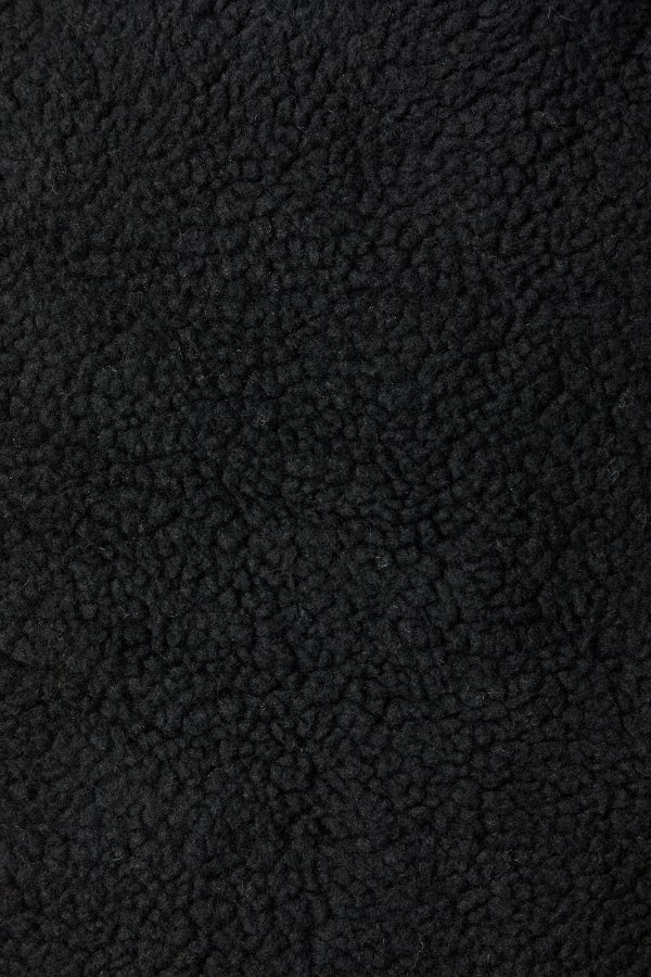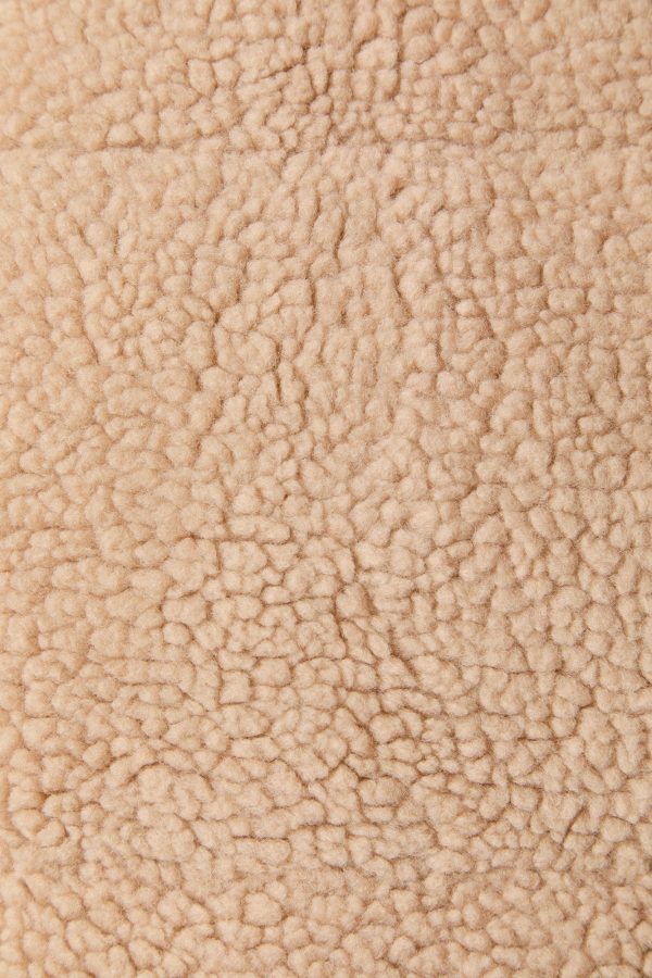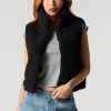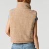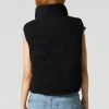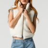This vest features Sherpa material, puffer construction, mock neck, pockets, and zip-up front.