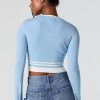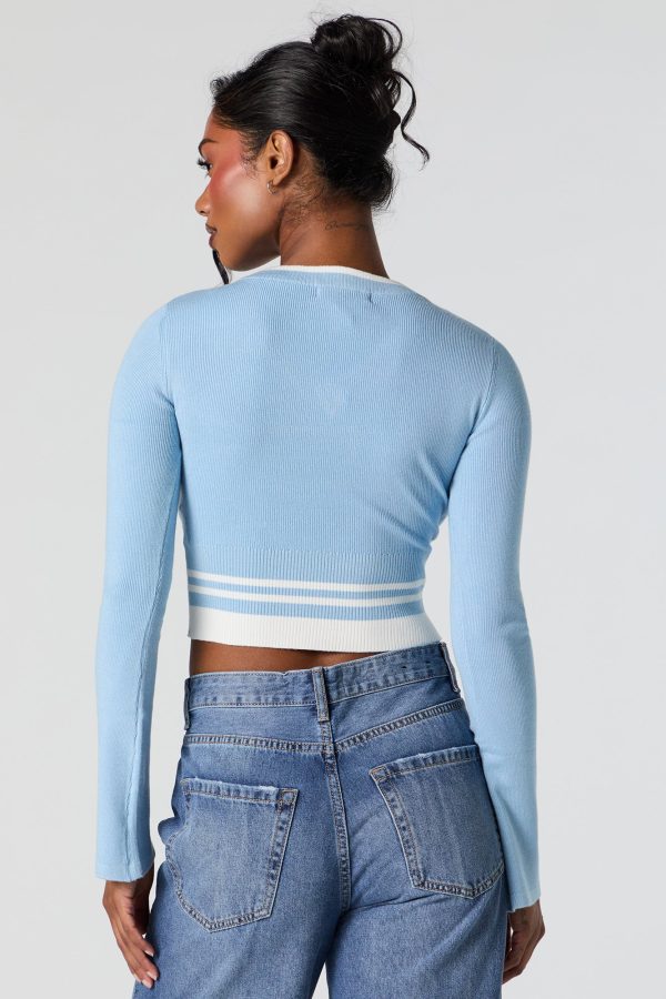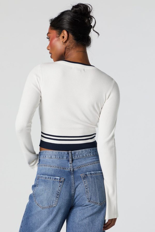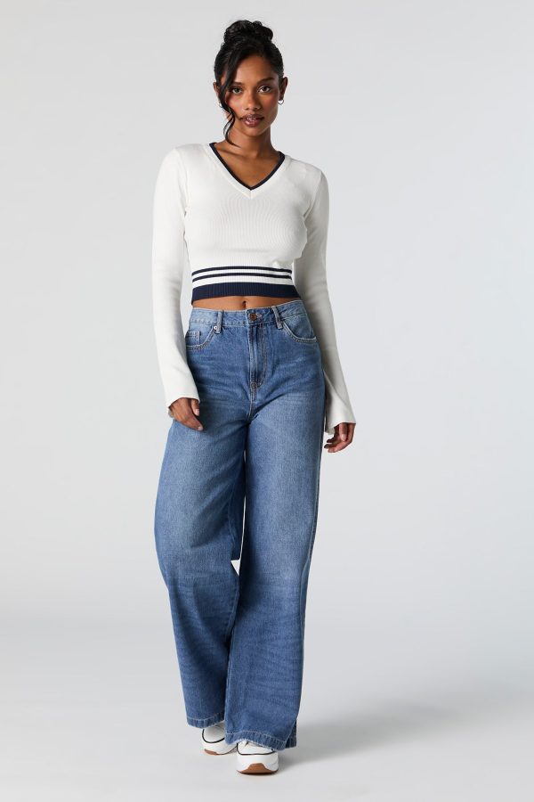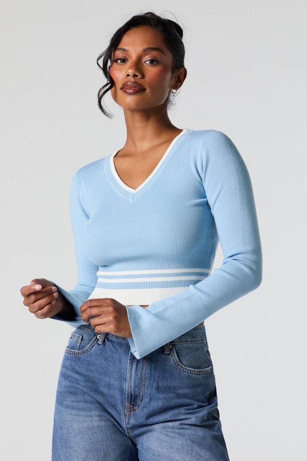 Striped Knit V-Neck Bell Sleeve Cropped Sweater