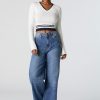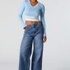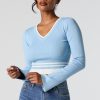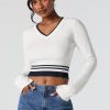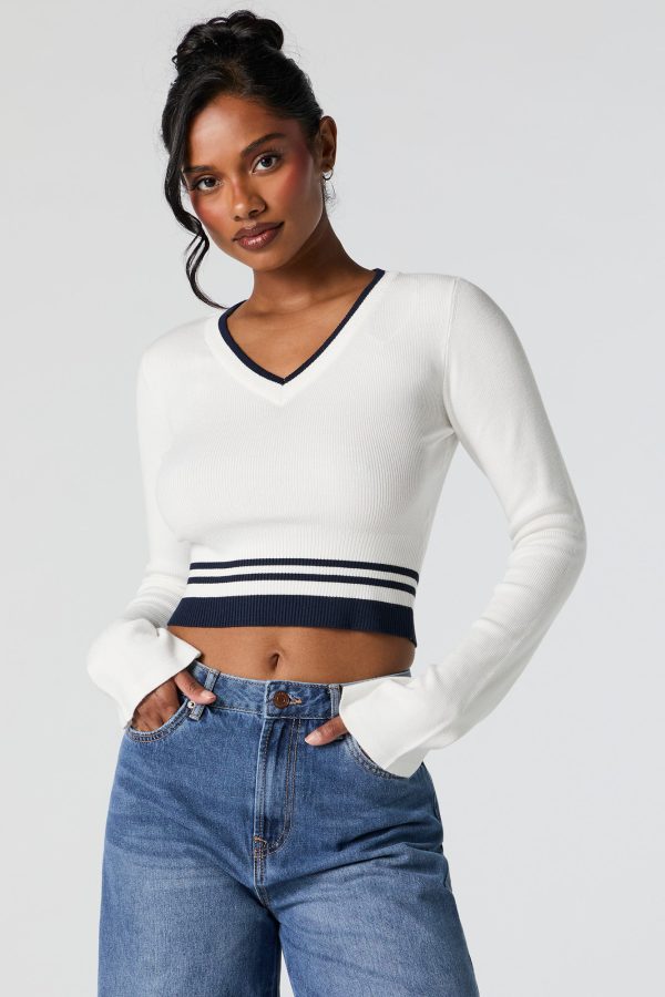 Channel your inner knIT girl this season. This sweater features striped ribbed knit material, V-neckline, long bell sleeves, and cropped hem.