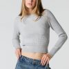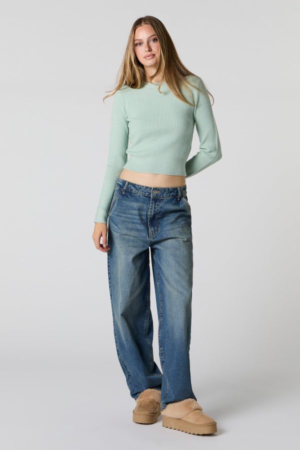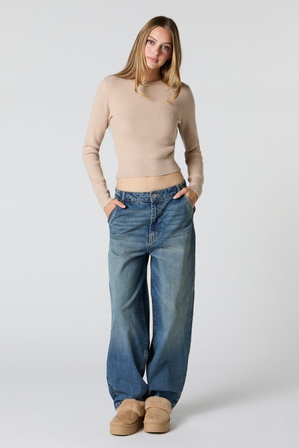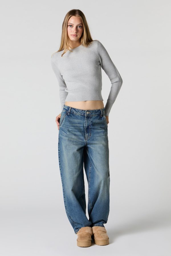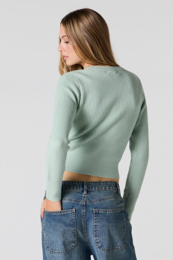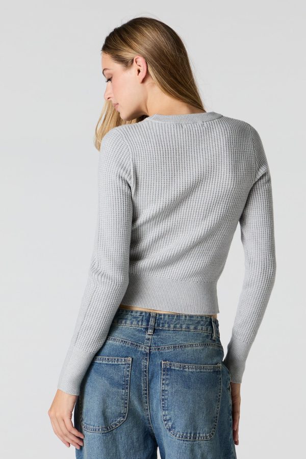Sweater weather forever. This sweater features waffle knit material, crew neckline, long sleeves, and skimmer length.